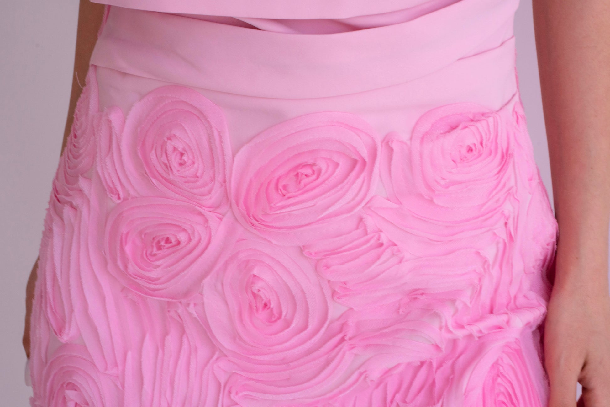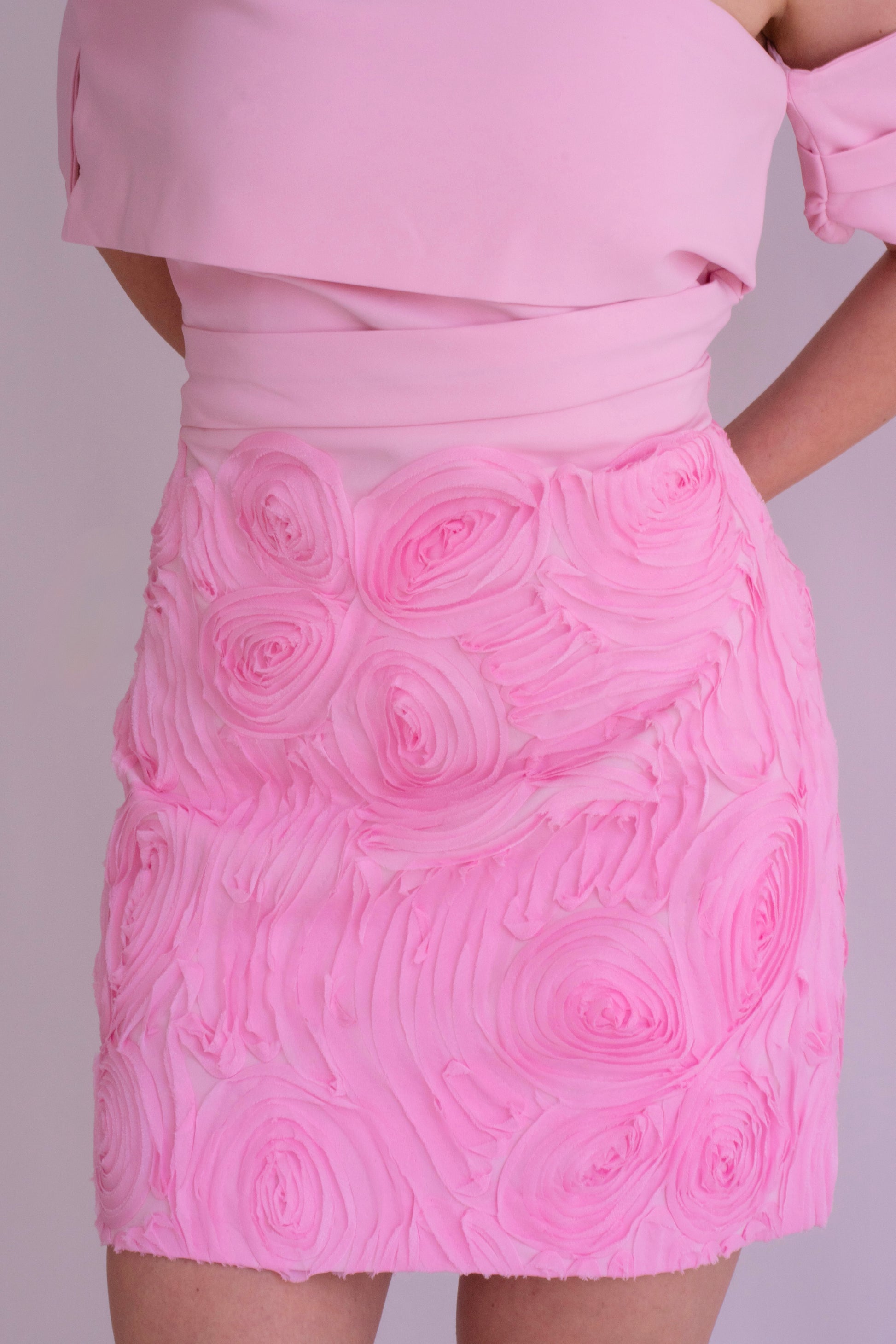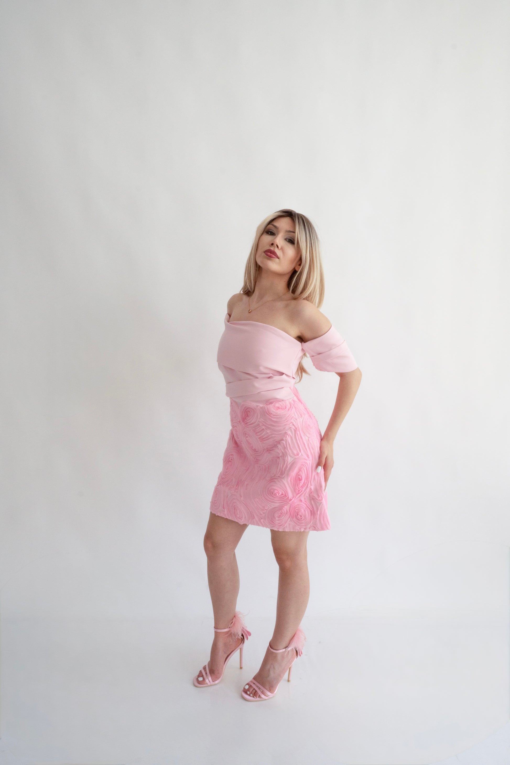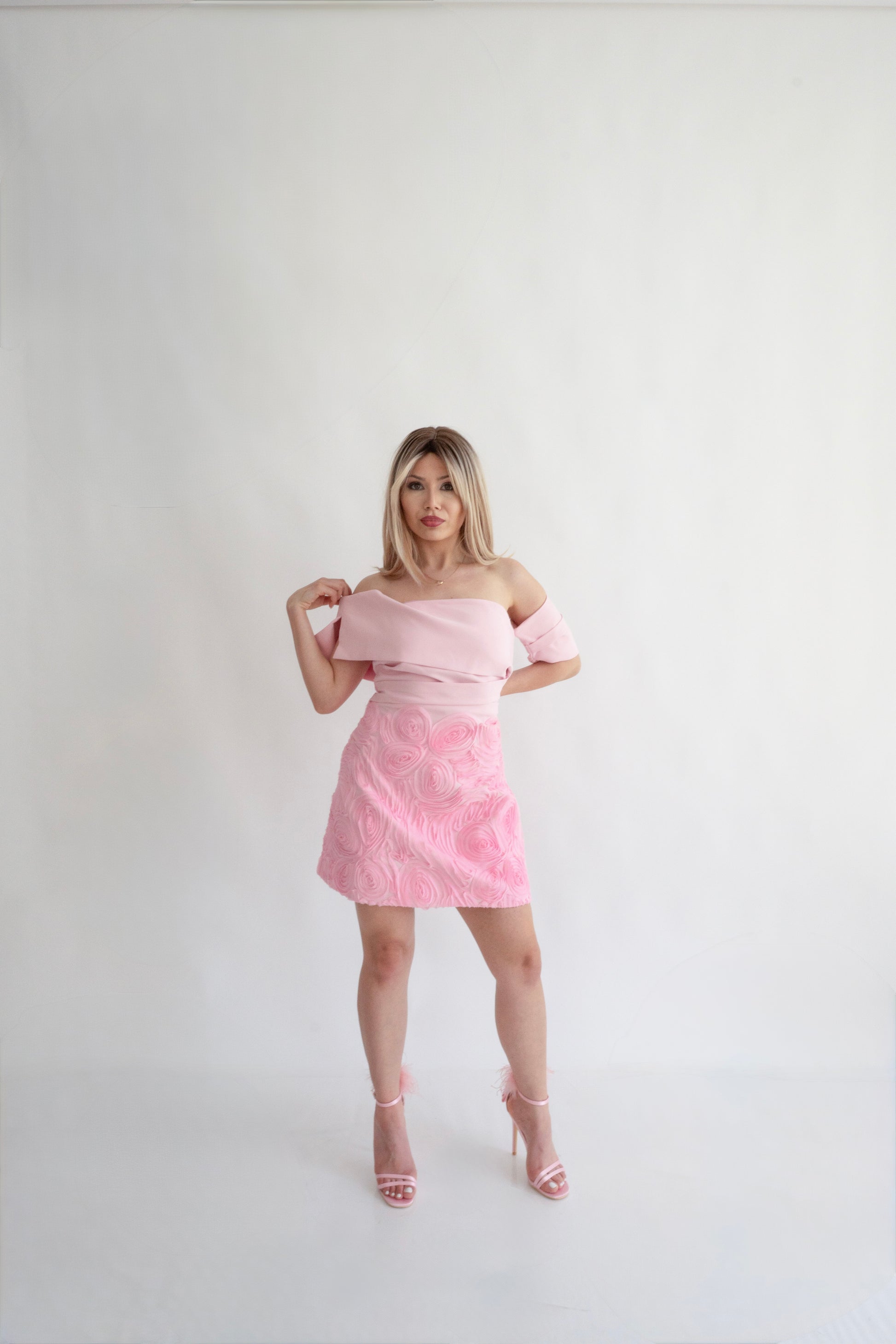 Rochie roz pudrat “Floréa” scurtă, pe umeri, cu flori aplicate – feminitate în floare